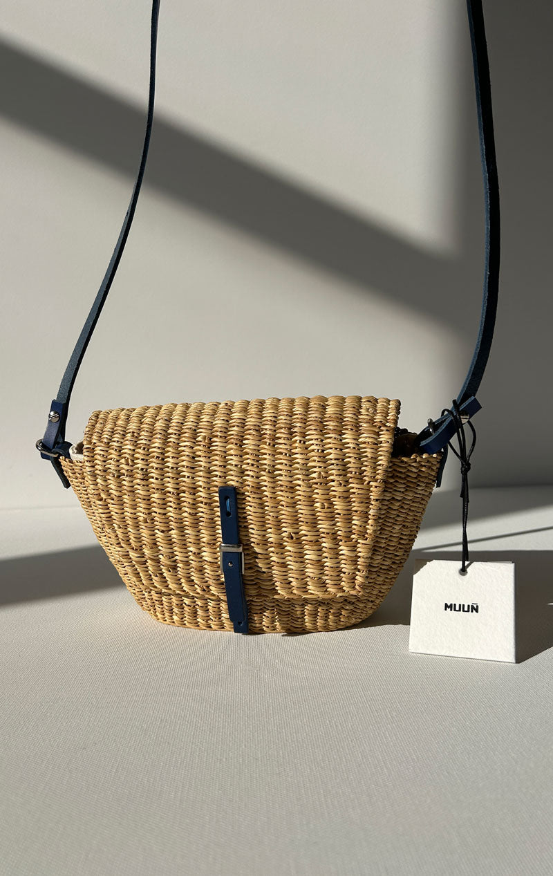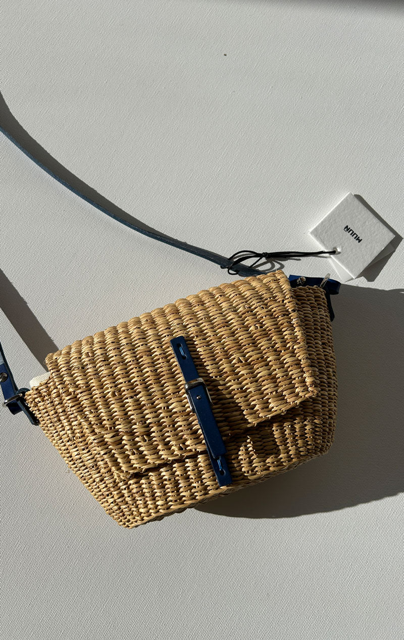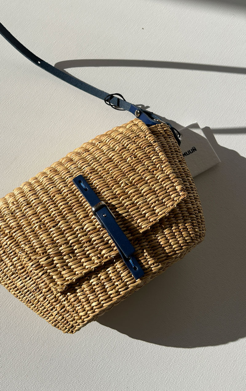 Made by Muun a French designer who works with artisans in Ghana using local straw grass. Each bag has a liner in cotton. The bag had enough room for a cell phone and a wallet on the go