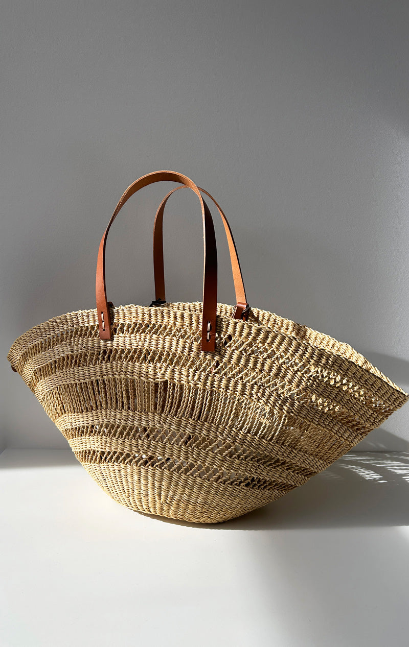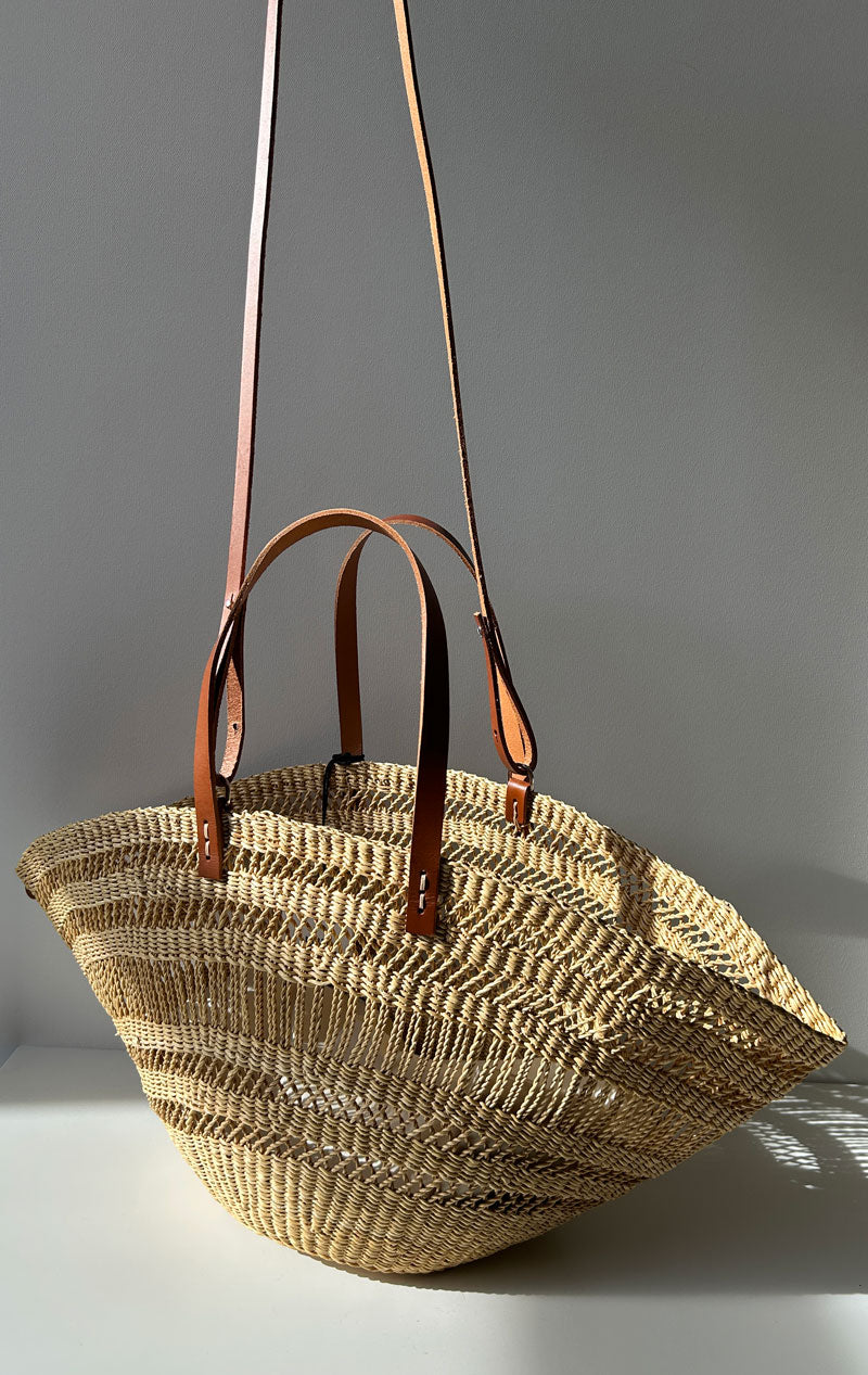 Muun works with artisans in Ghana using local straw grass; there is an internal canvas pouch which is removable as well as a shoulder strap