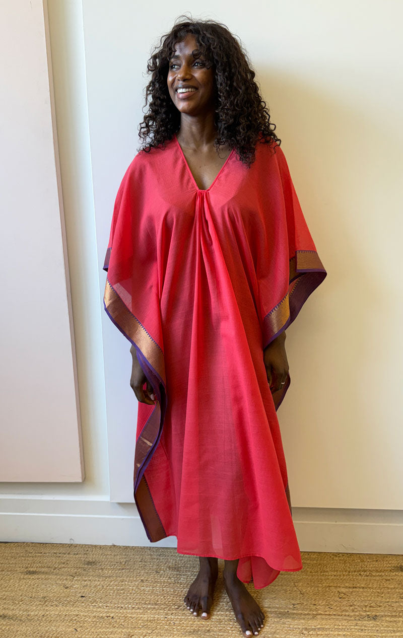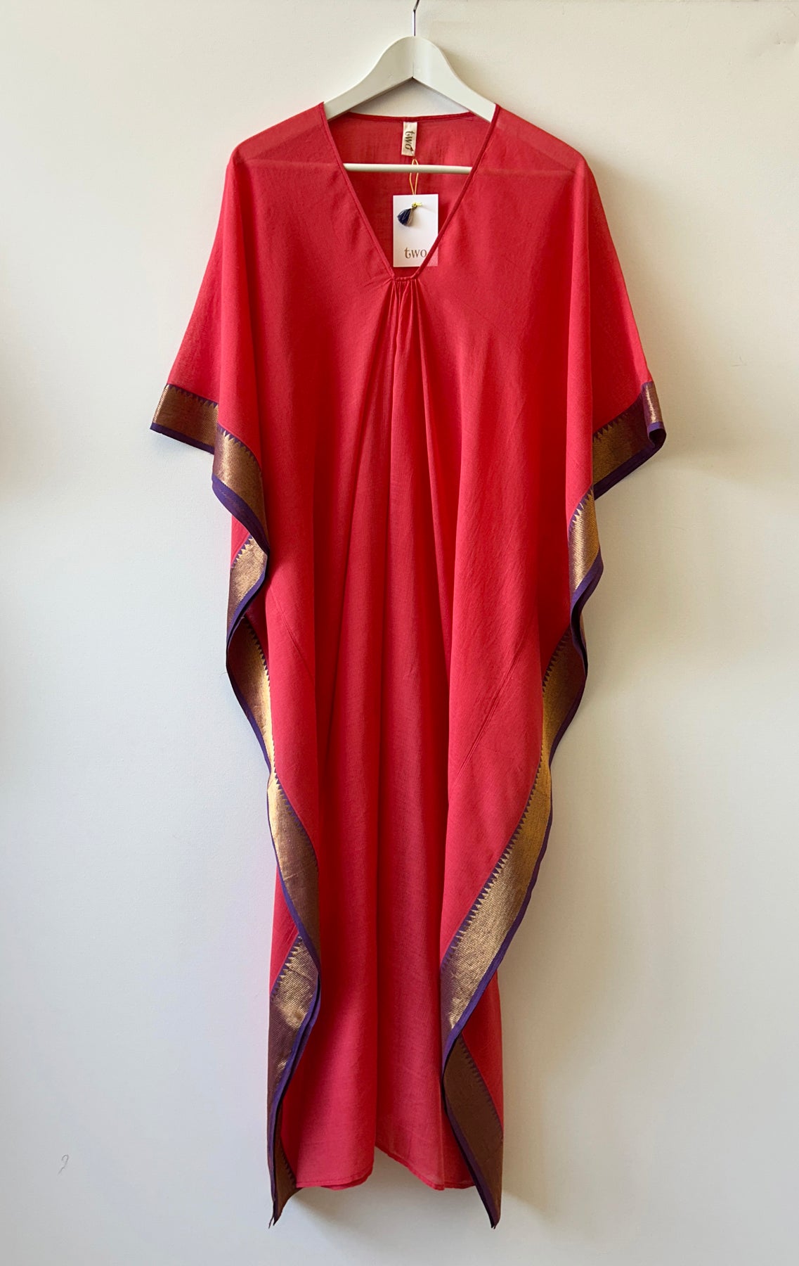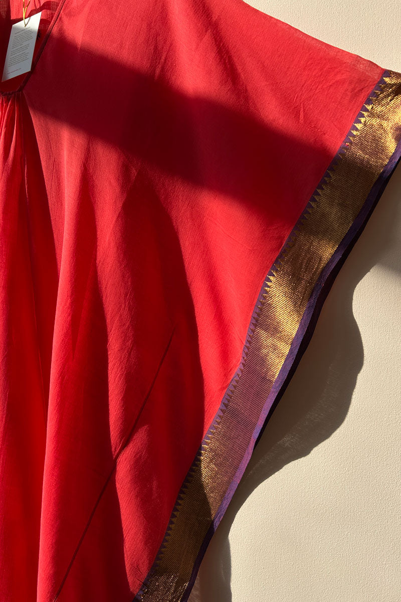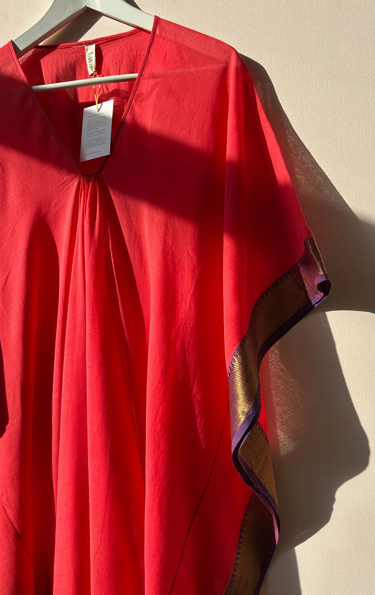 A one of a kind mangalgiri sari caftan in a beautiful bold cherry red with gold borders.  Semi sheer handwoven sari fabric. Perfect summer caftan.