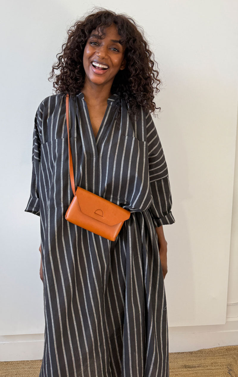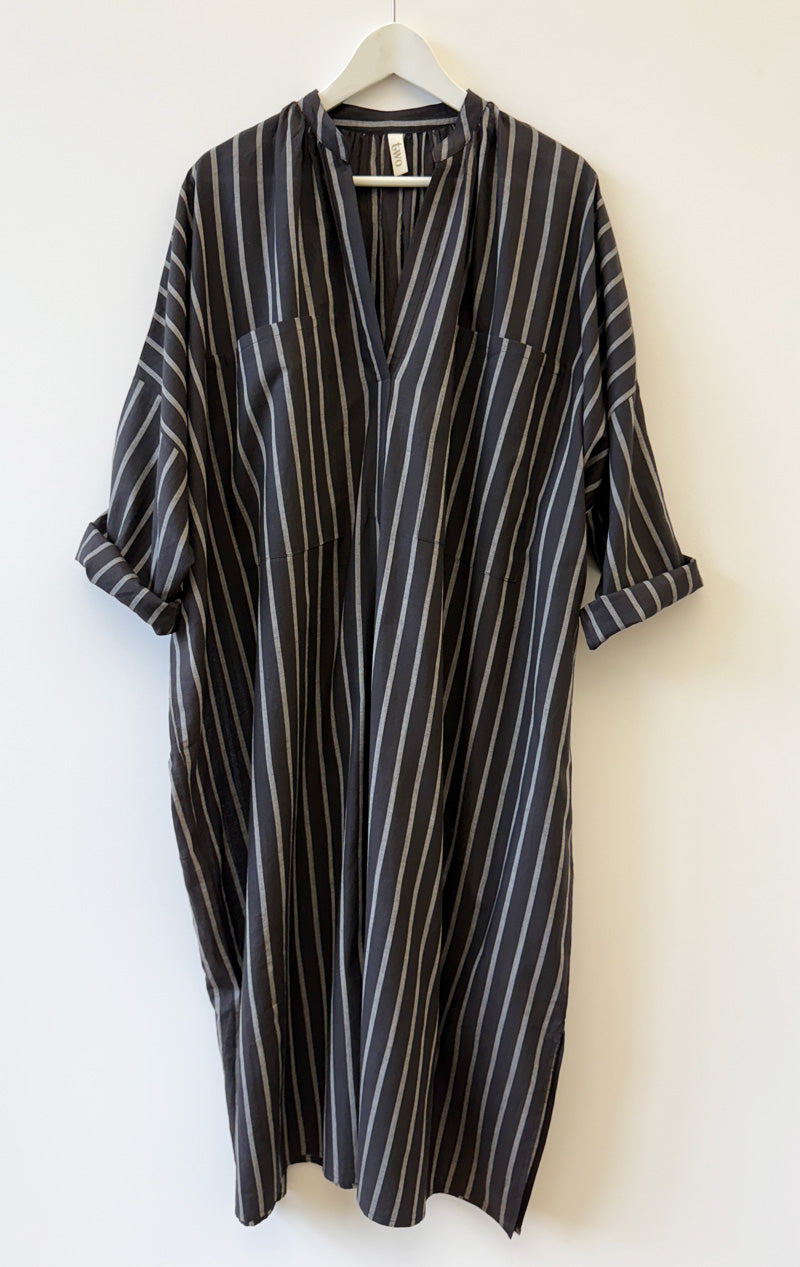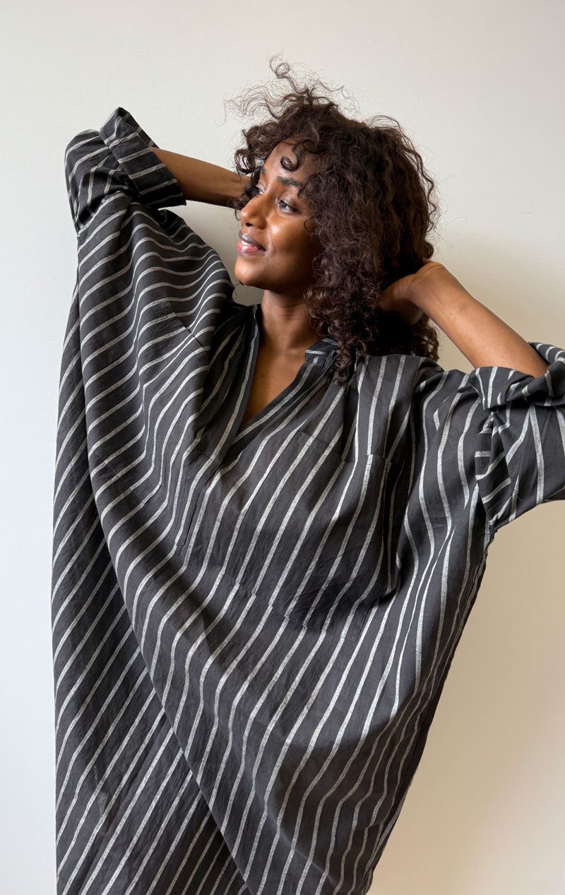 A modern chic caftan in black and white  stripe with two large front  pockets.