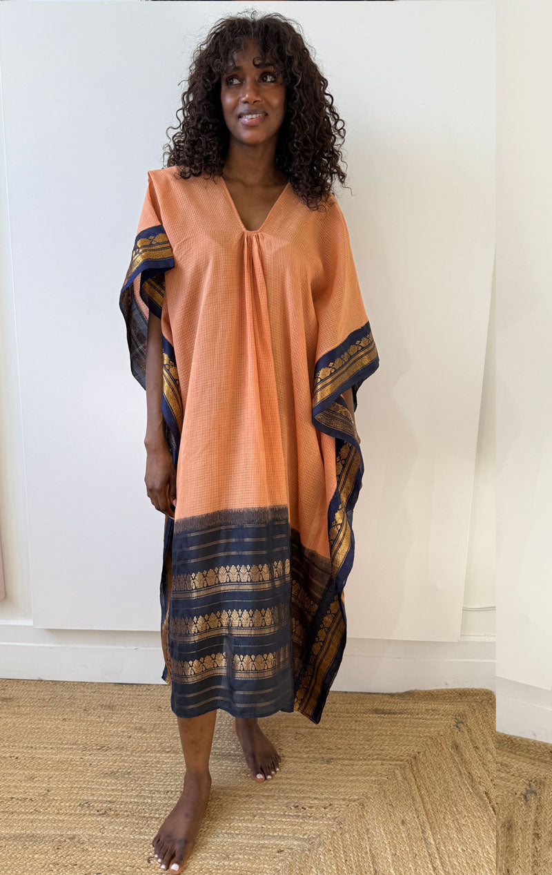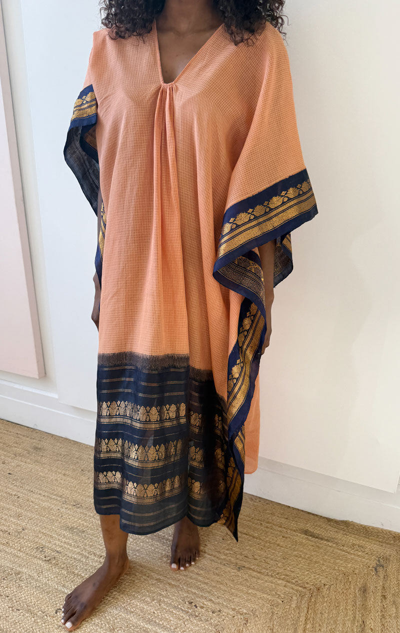 A gorgeous sari caftan with Navy and gold front. Borders are navy with gold. Dramatic and beautiful. Authentic sari fabrics. Long 49" caftan, semi sheer.