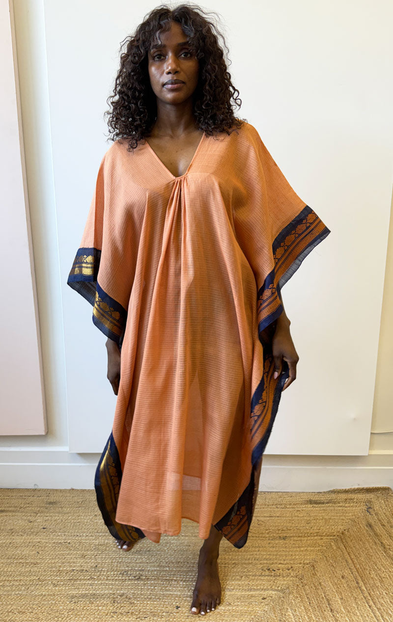 An elegant sari caftan with duo tone gold mix border. Long caftan, semi sheer. AN AUTHENTIC sourced sari in handwoven cotton/silk mix.