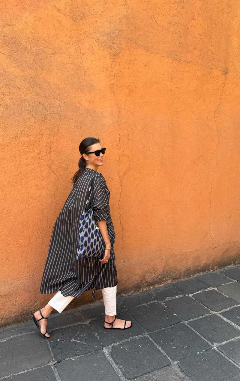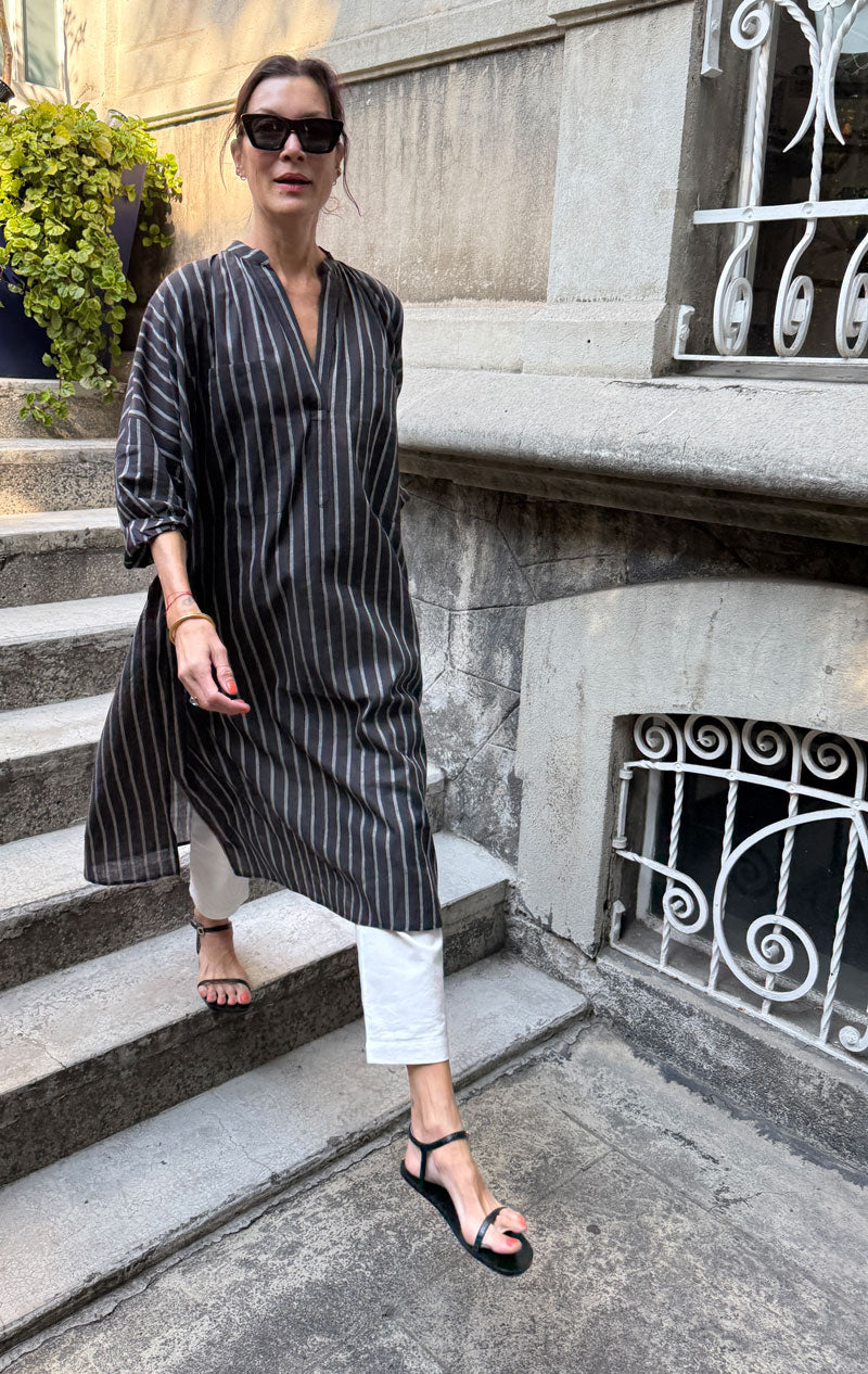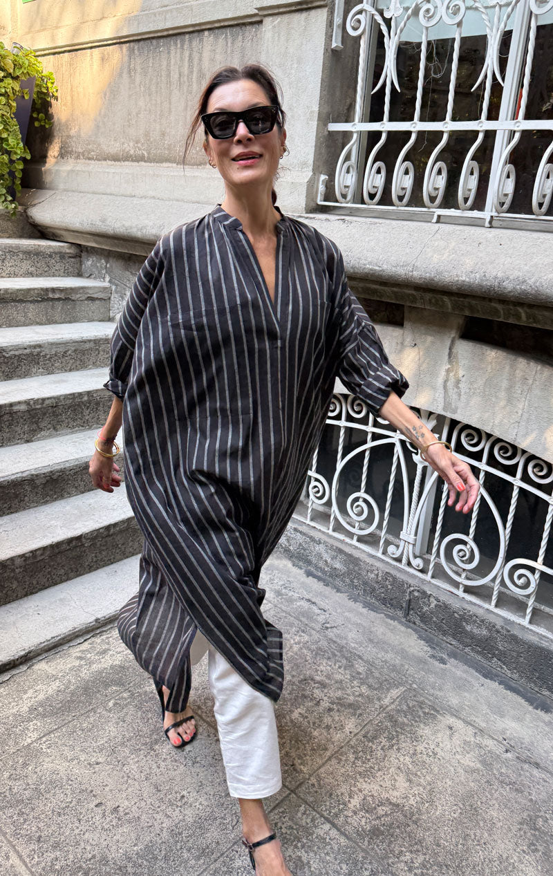 A best seller is back in stock! We are getting rave reviews on this minimal lightweight caftan. Versatile enough to wear as a dress or combine over our khadi pants  for a chic polished look.