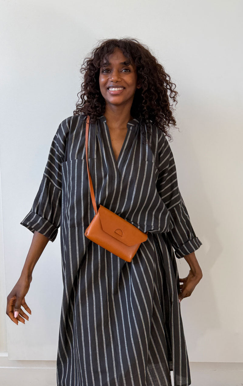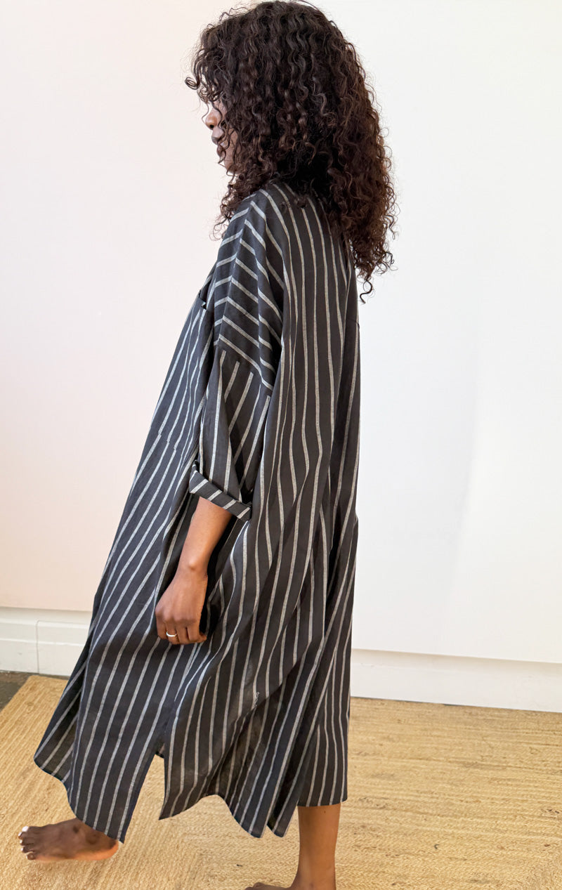 A modern chic caftan in black and white  stripe with two large front  pockets.