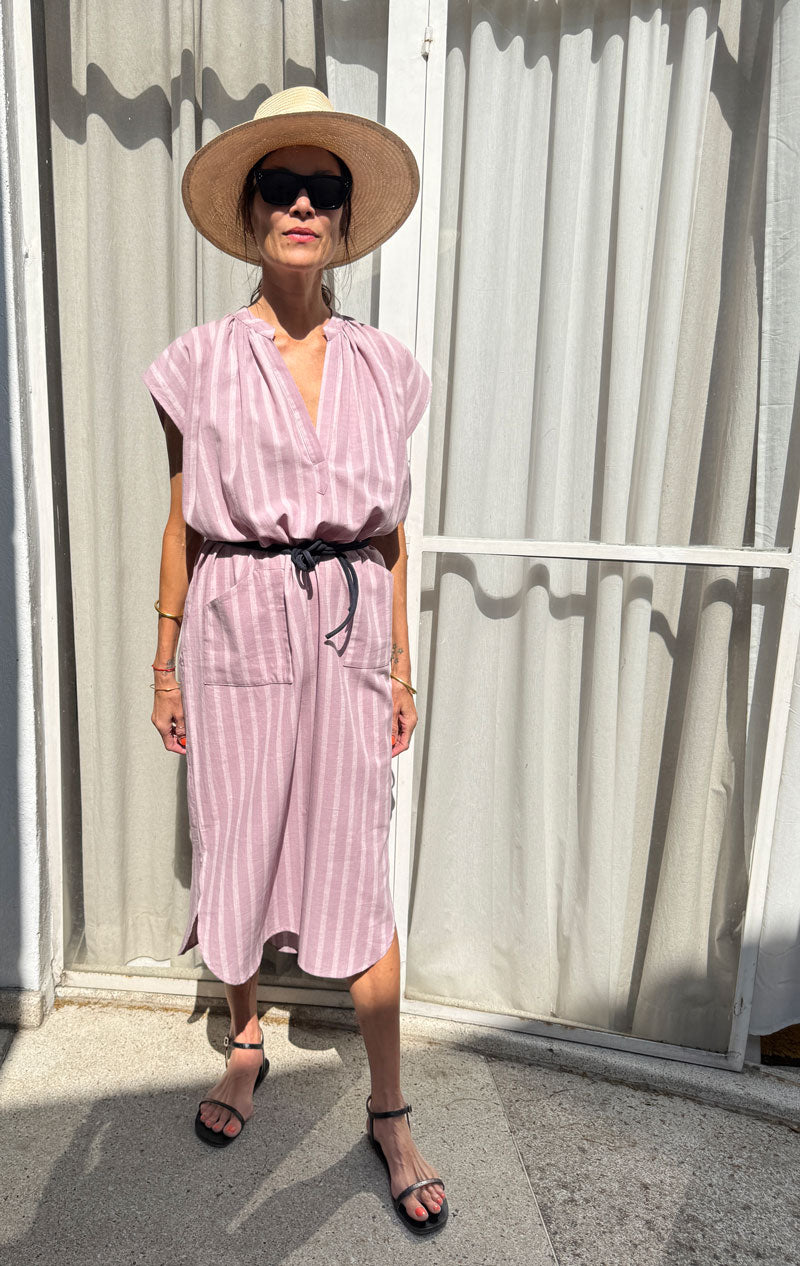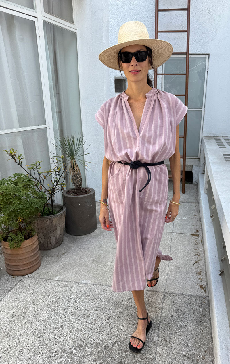 Our slim dress is back in a lavender stripe for summer.  Opaque and easy to wear all summer long. we recommend belting it with a ribbon or interesting belt.