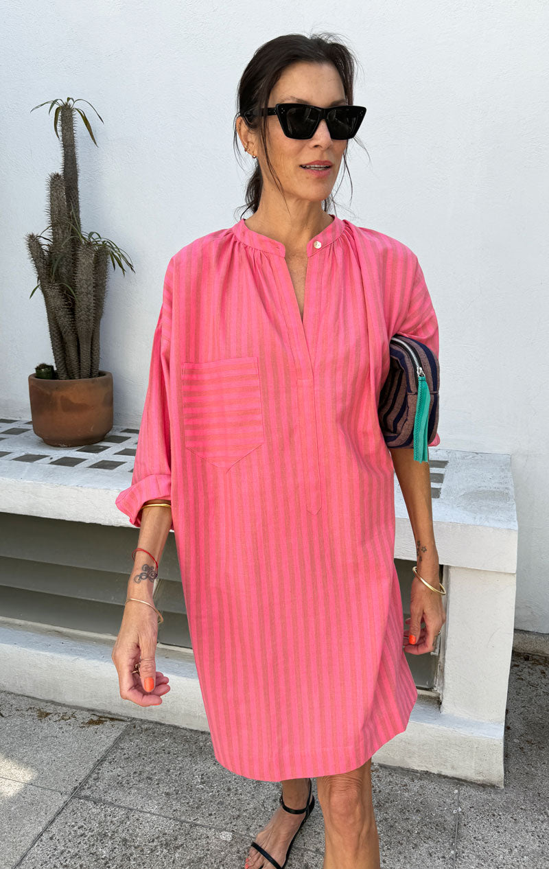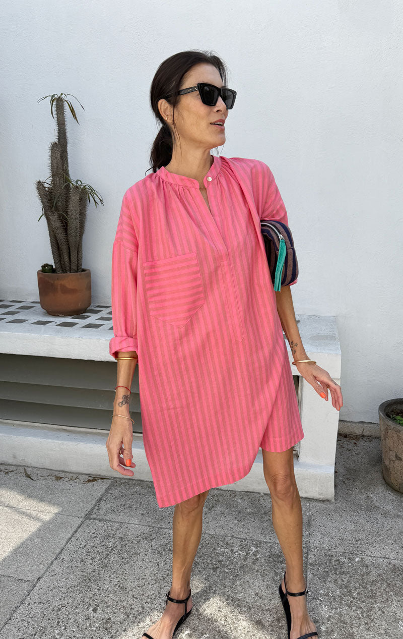 A bright pink tone with one side pocket. Model wears the size 2 for an oversized look on images 1, 2