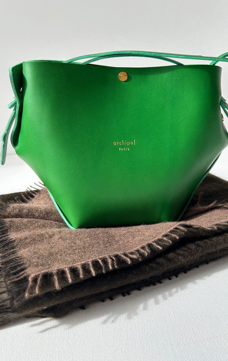 We first discovered these handmade bags last summer in St.Tropez and we were smitten! This bucket bag comes in 2 color combos, green or lilac with a green strap. It has adjustable straps and an origami shape with clever joining. The bucket Le Panier fits a good amount of items as a medium sized bag.. built to last forever. seamless finishes. artisan made.