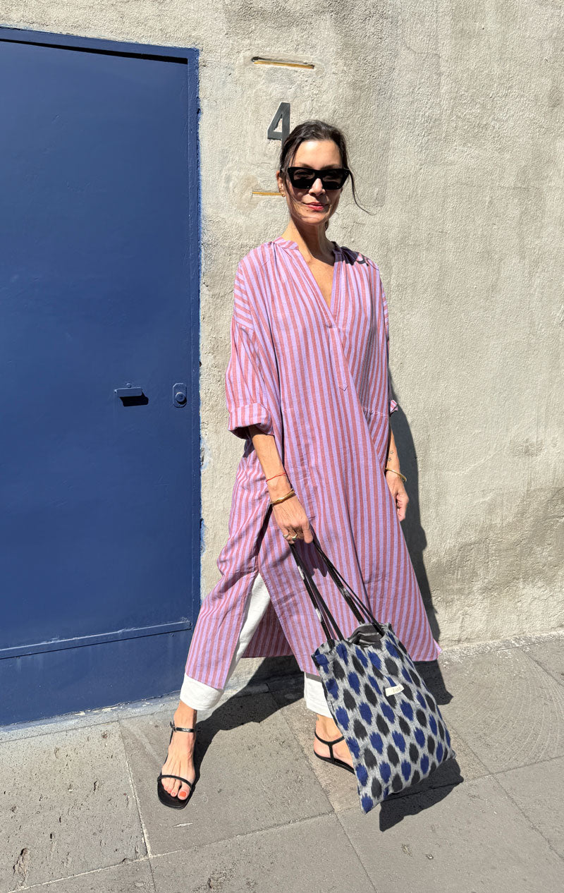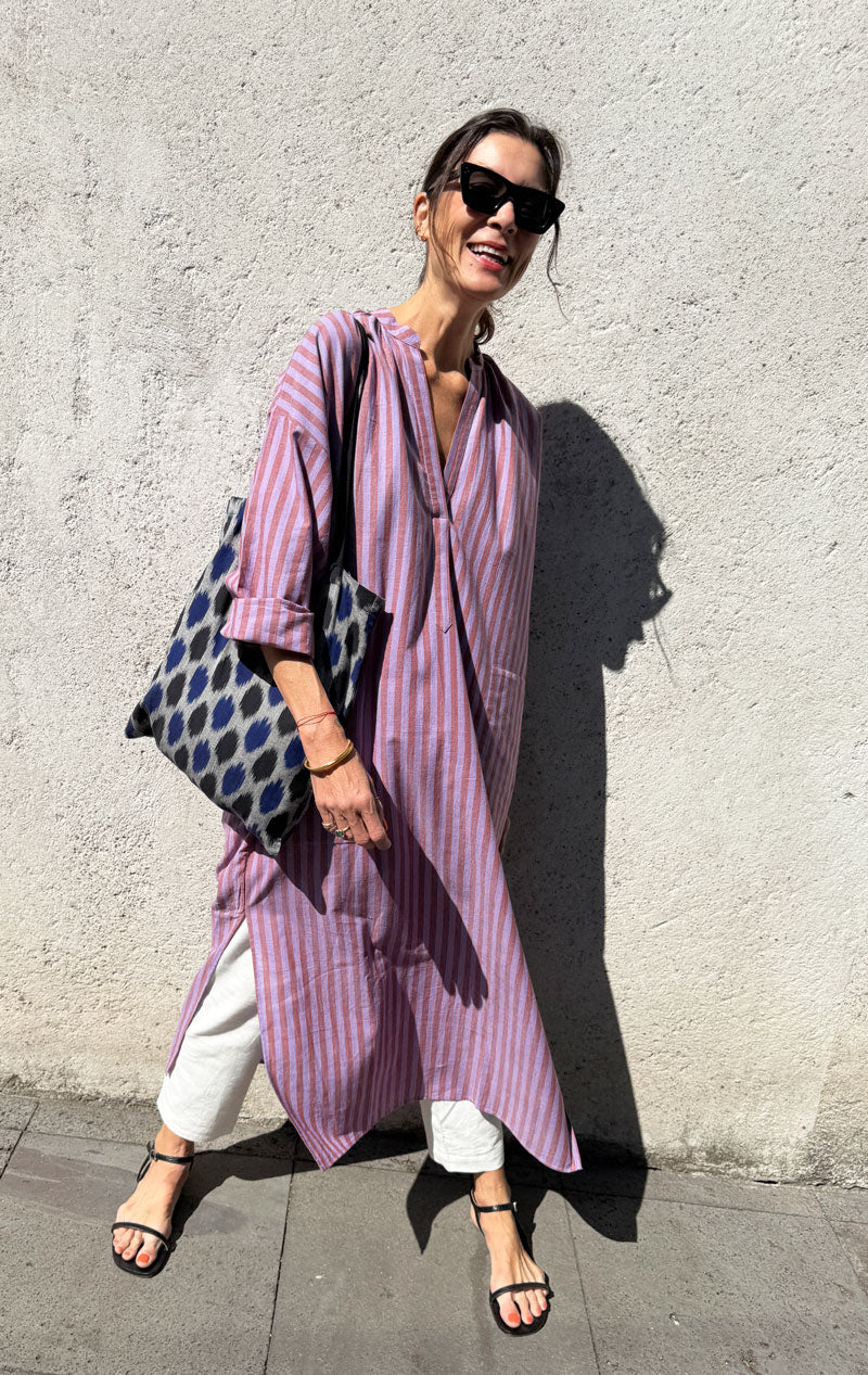 A modern chic caftan in a two tone stripe. Handwoven cotton, with great coverage + two large side pockets. So comfortable you won't want to take it off! an opaque weight