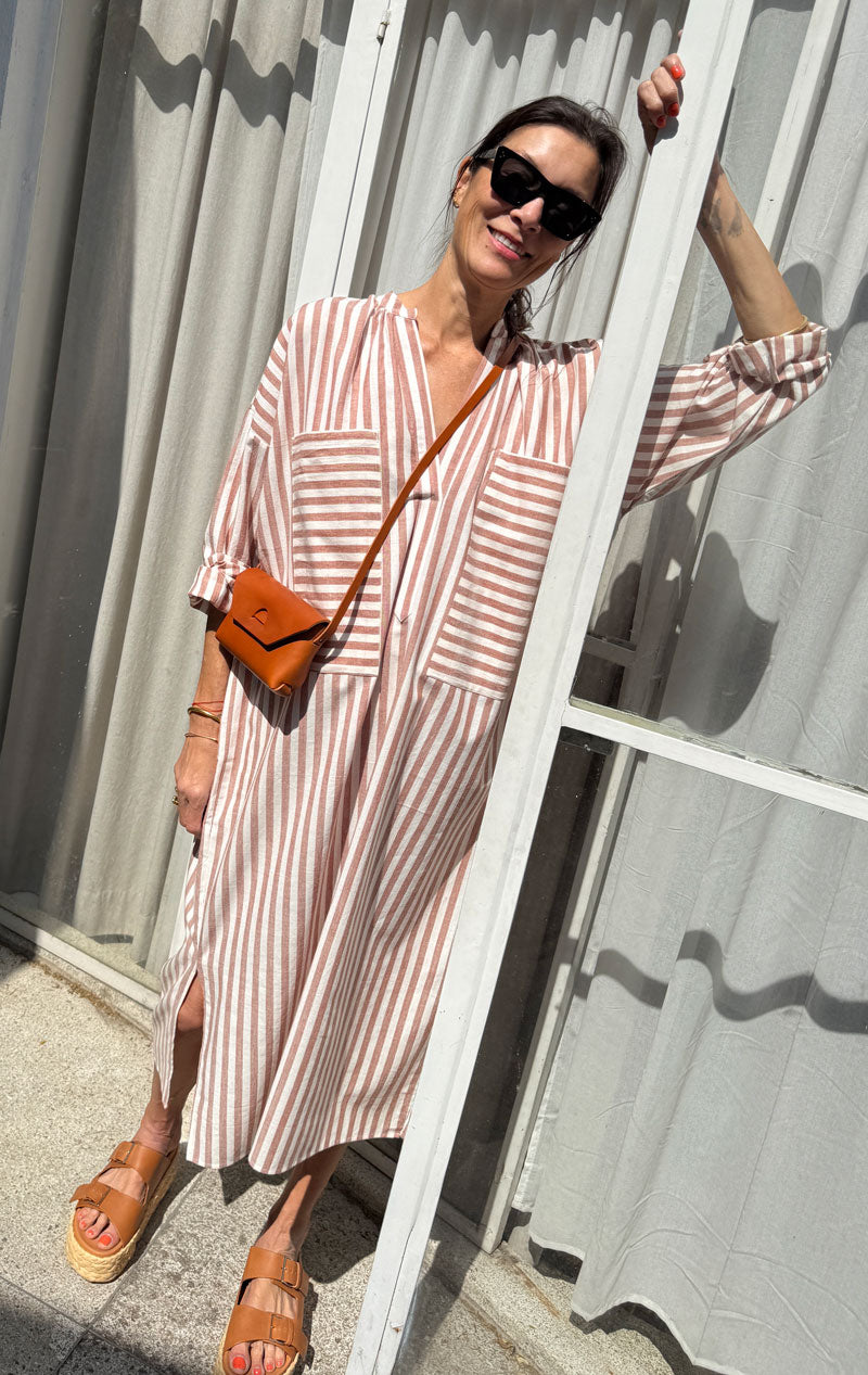 Terracotta/ Natural stripe two pocket caftan