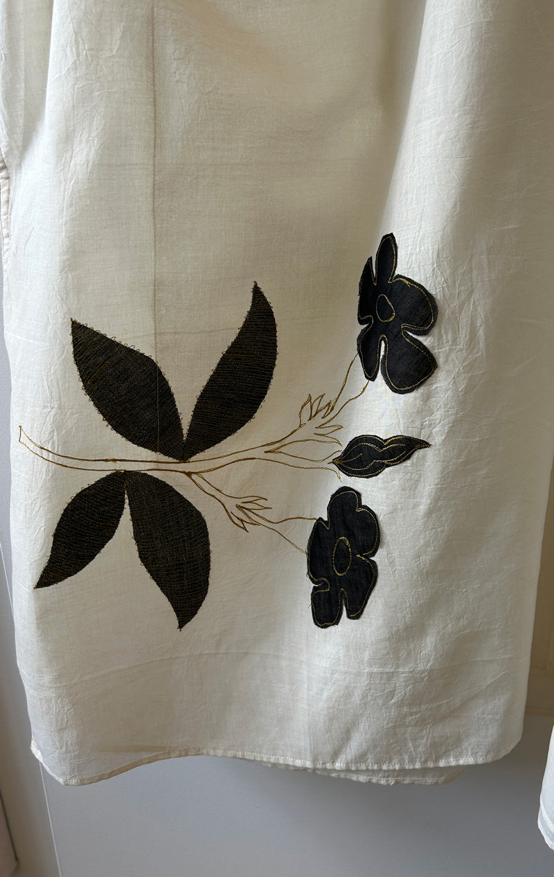 Color: White with black appliqué florals