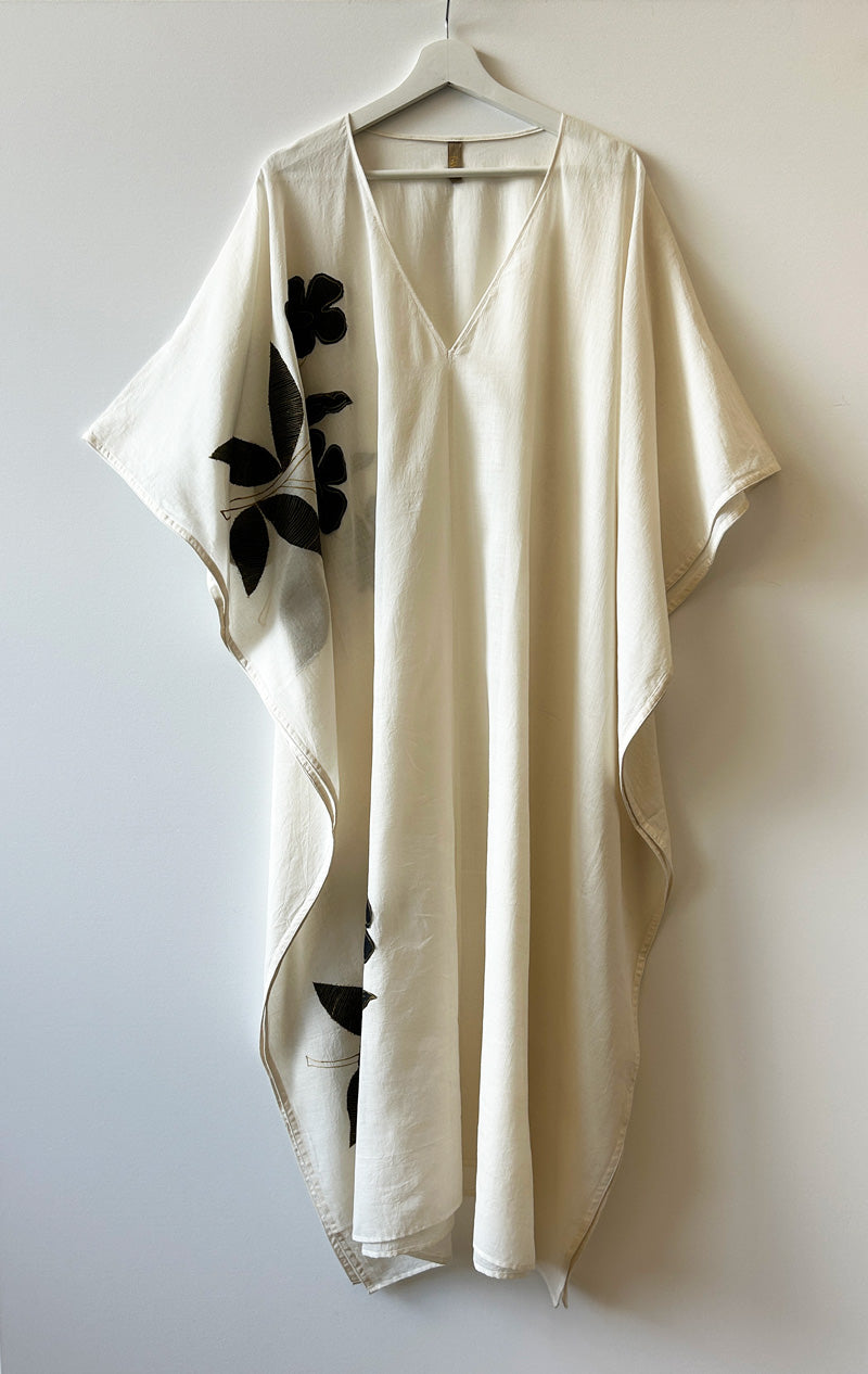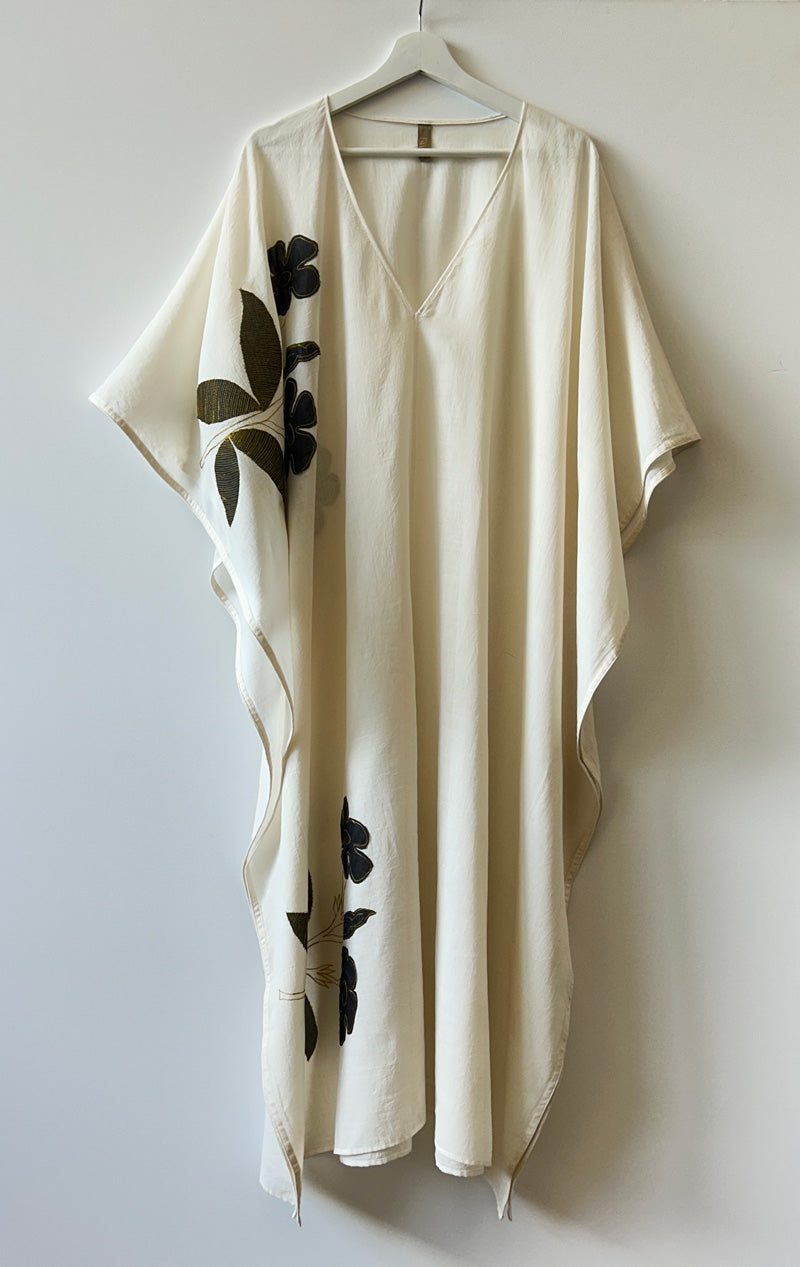 White v-neck applique floral Caftan