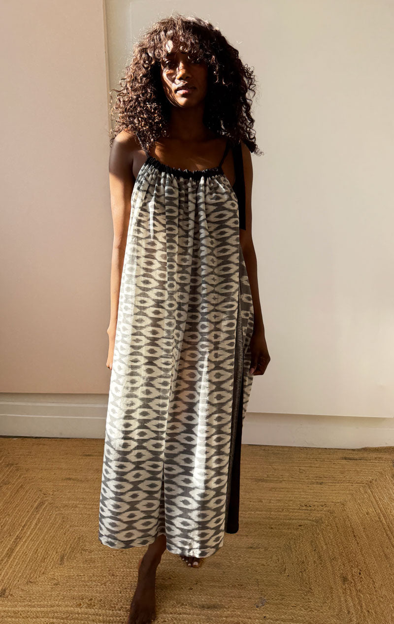 Our original drawstring dress in Ikat Fabrics. Easy to wear beach to city.