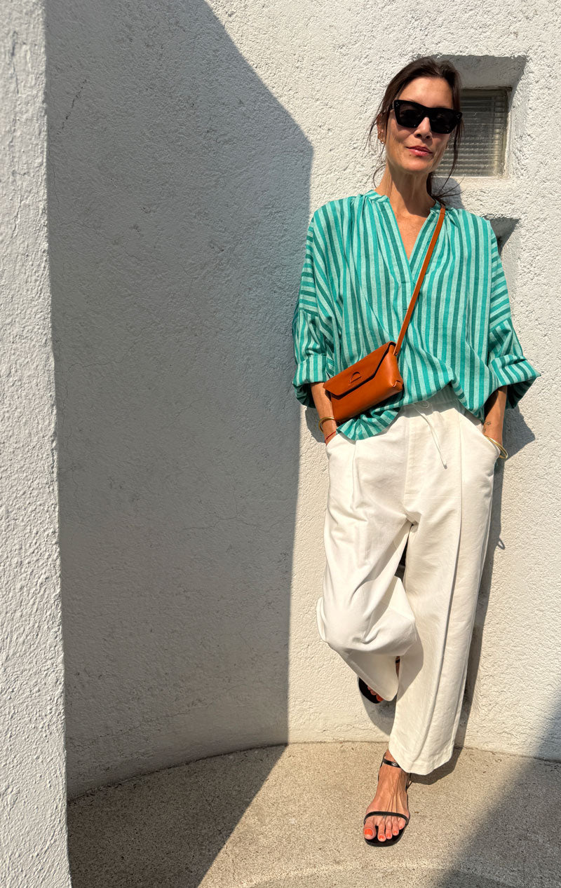 We have a small run of these elegant pleated pants with large elastic, So comfortable yet chic in a khadi handwoven cotton. Our pleated pant has a wide leg with pleat and a comfortable waistband.  Chic & easy.  Fabric is a heavier weight handwoven cotton Khadi. We have been selling these out of the box!