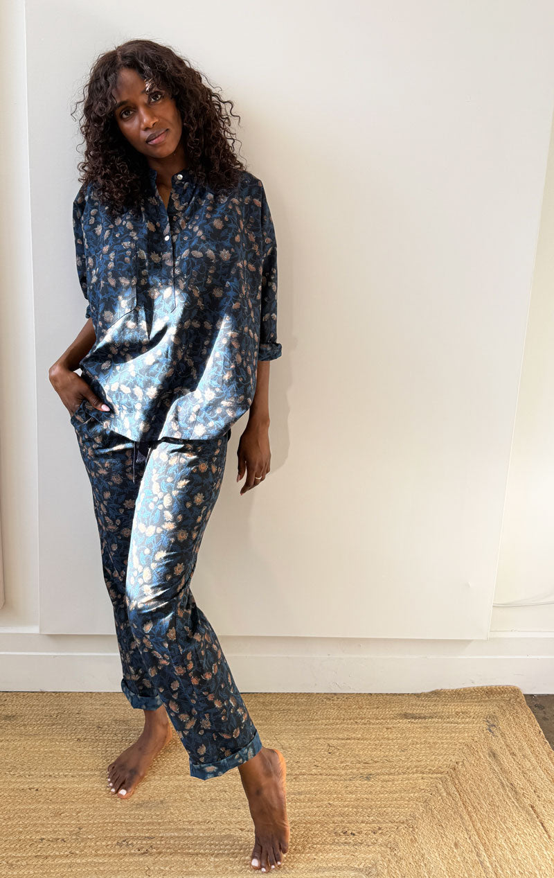 A drawstring straight leg pant  in a chic floral bockprint.