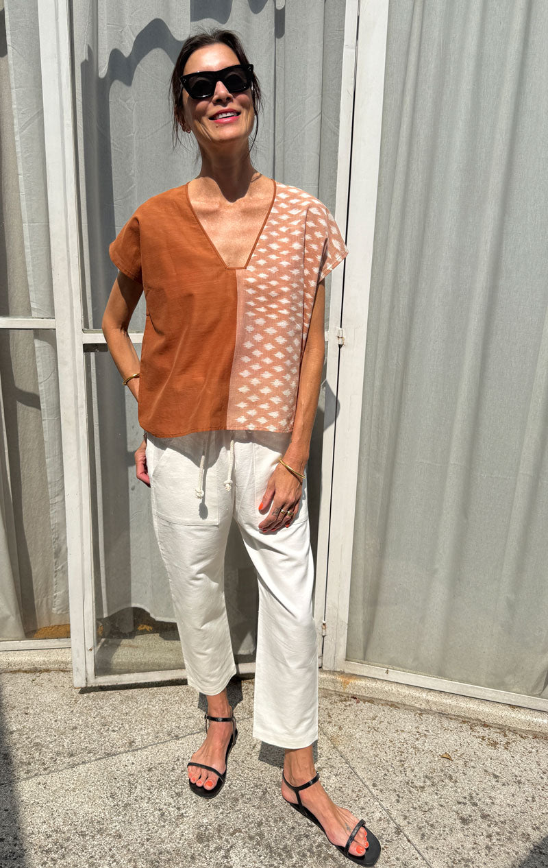 our chic khadi paperbag pant with cord tie. This soft thicker handspun cotton has won us over. Comparable to a soft canvas feel & Great to wear spring into fall. We love it styled with our chambray shirt! Arrives in a crisp weight (shown in first image) and it brightens and relaxes with wash as shown on model. Expect a 1" length and 1/4 body shrinkage if thrown in dryer. This is all handwoven khadi cotton. We love the effect !