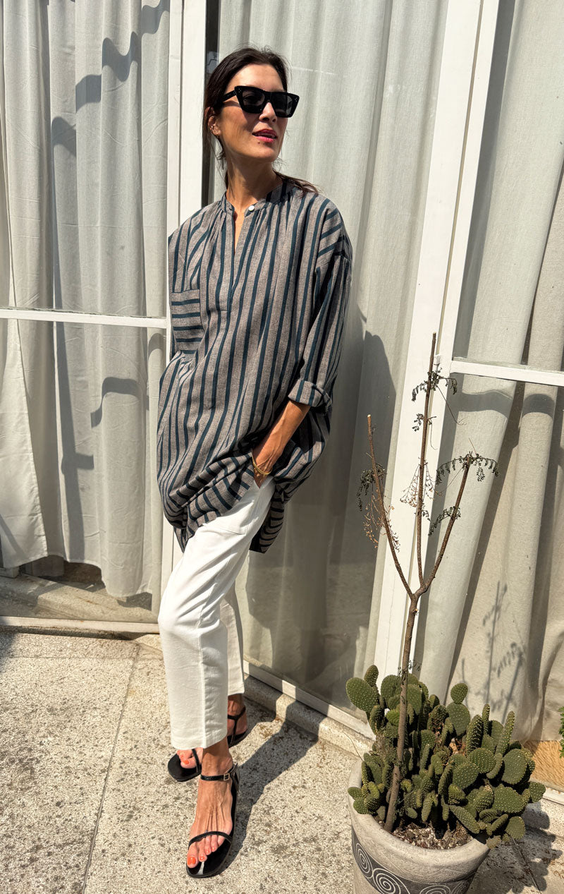 Incredibly soft cotton.tunic in a deep teal with peach melange stripe.