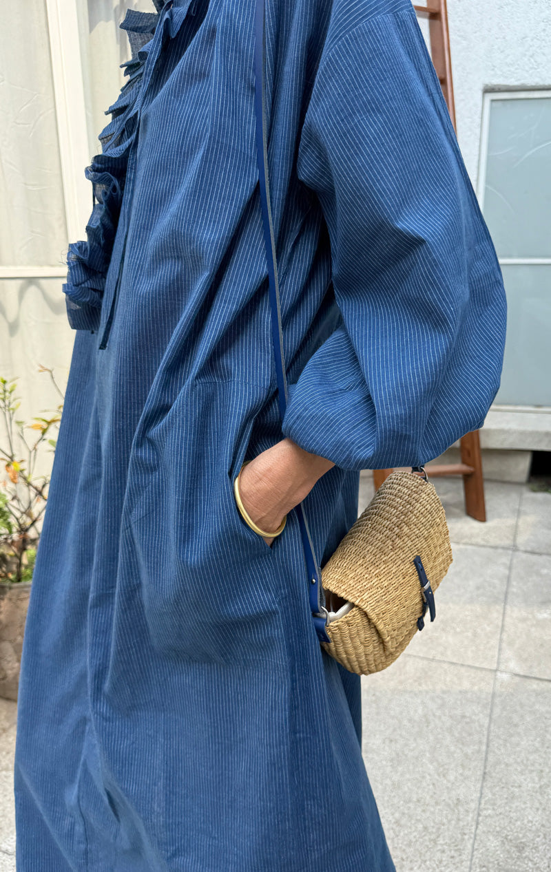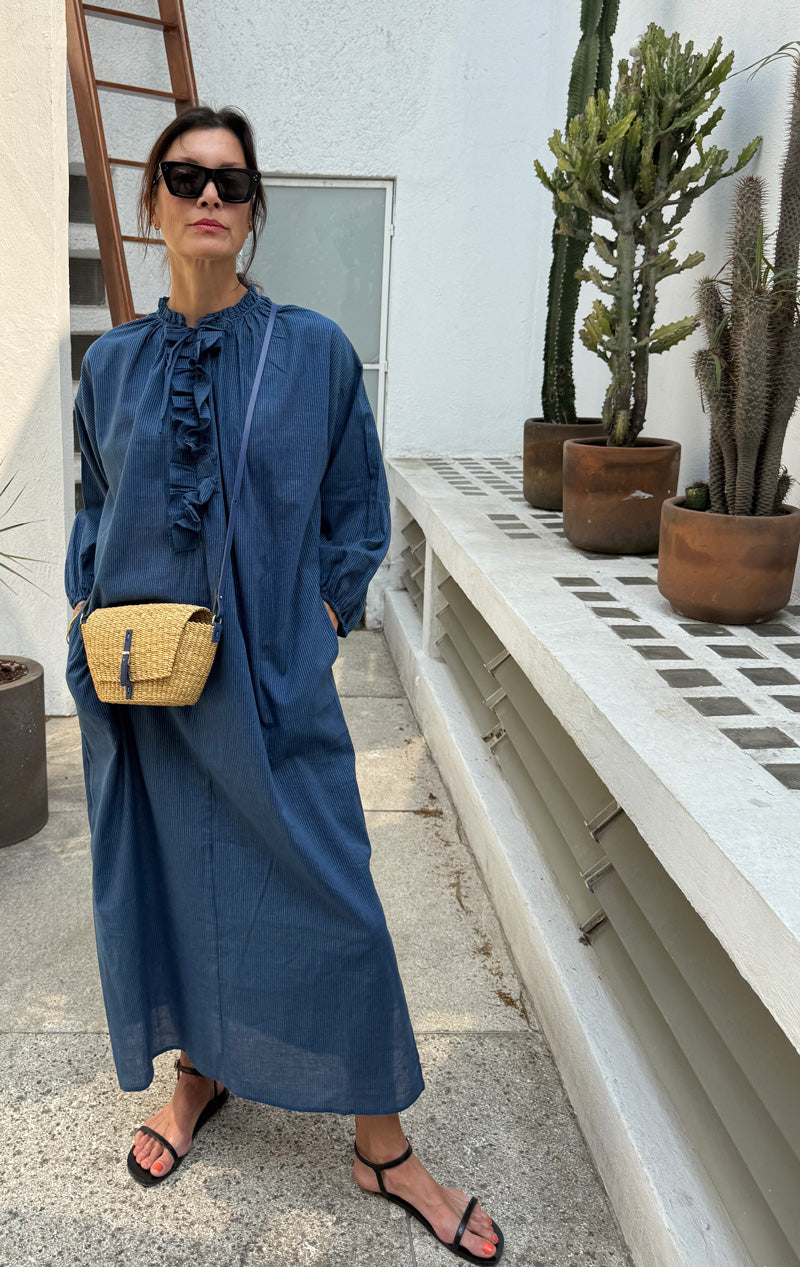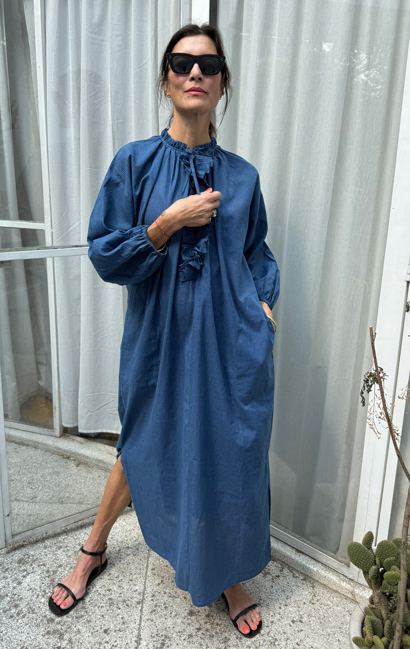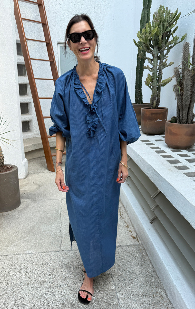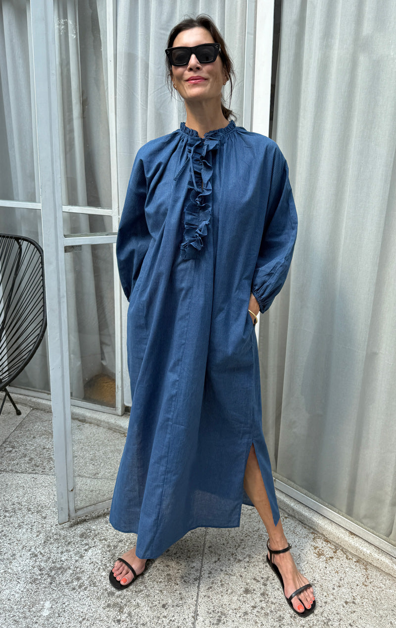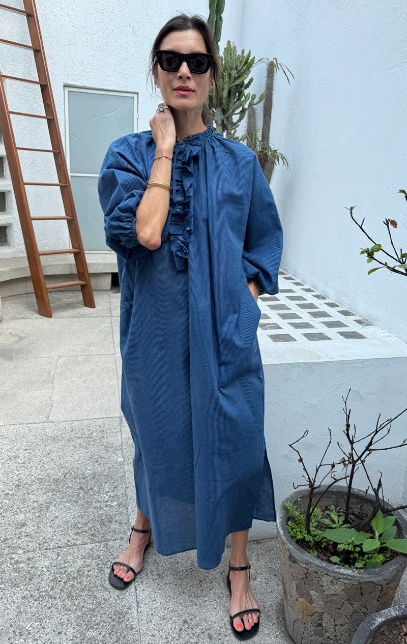 A lightweight cotton caftan with ruffle. Artisan made handwoven khadi cotton. Produced in New York. Ruffle neckline with tie closure.