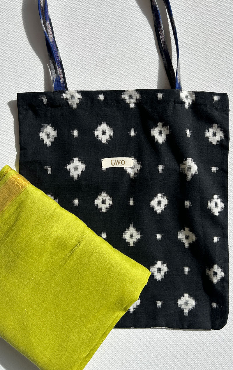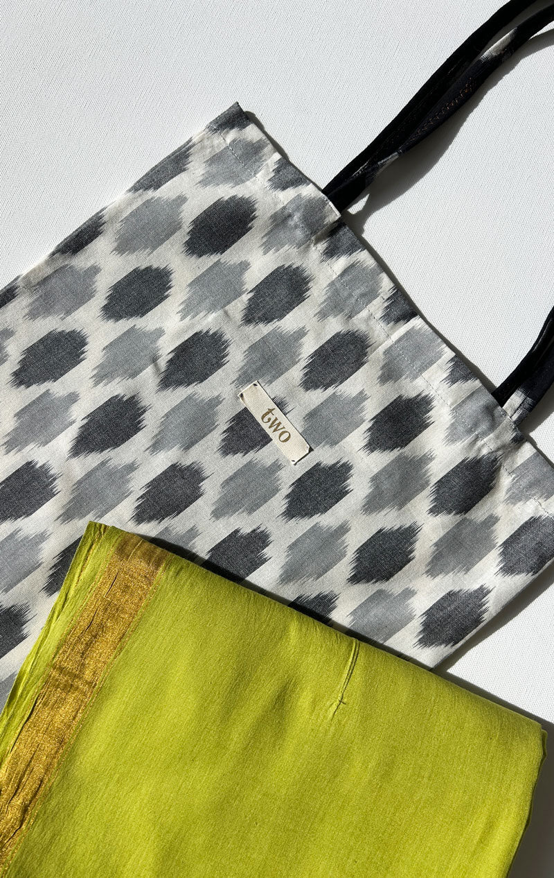 Our remnant tote bags. A lightweight ikat tote bag with thick handles made from misc remnant fabrics.