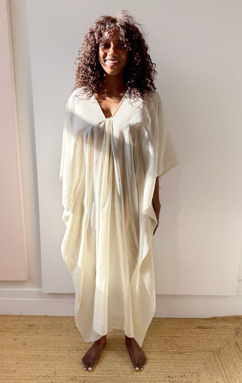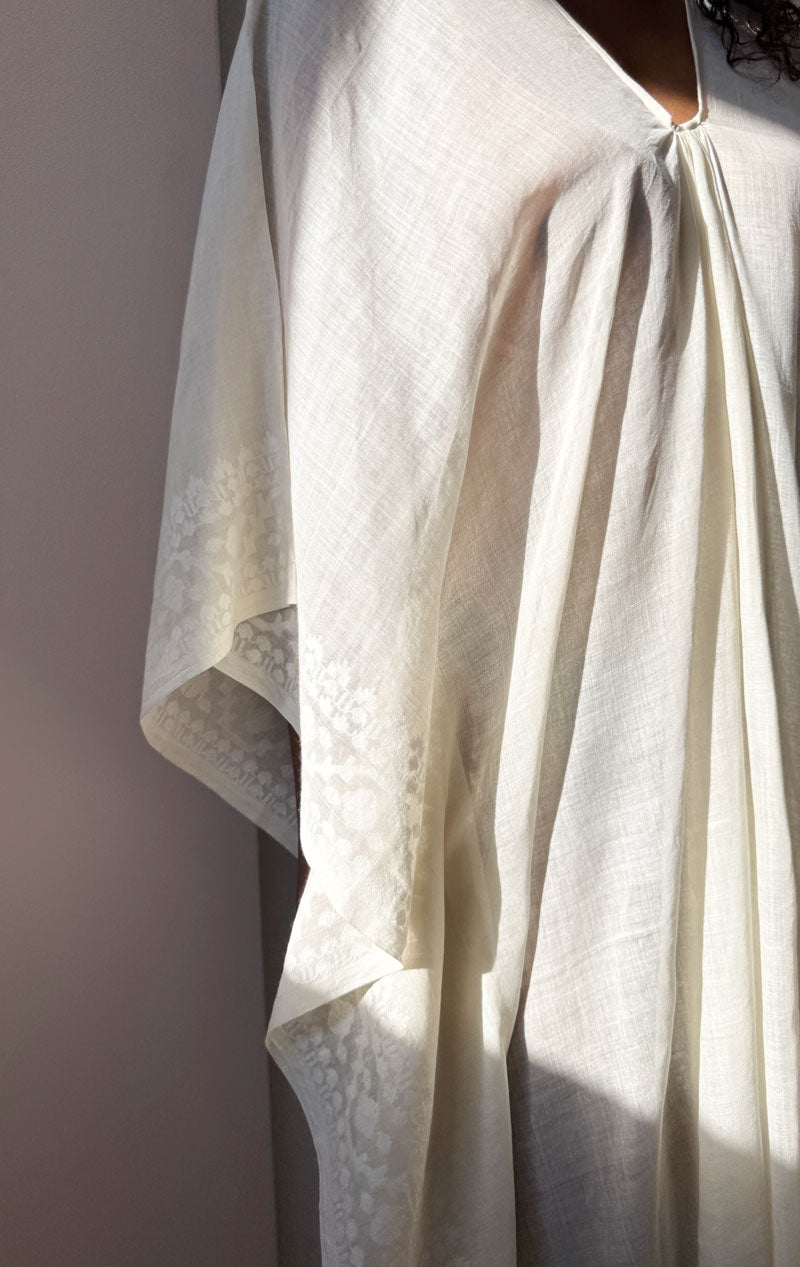 a sheer white caftan with beautiful embroidery on one sleeve. chic and subtle. Made from an authentic sari fabric.